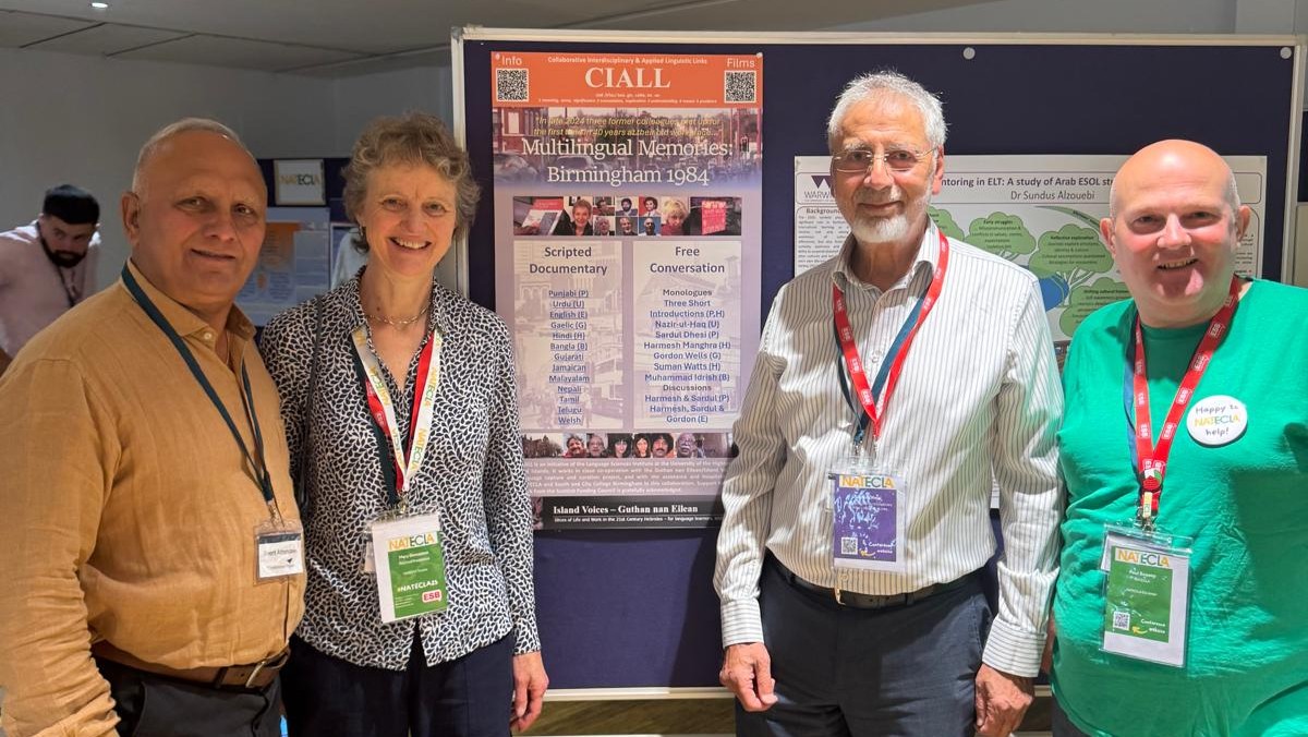 The recently completed Island Voices project “Multilingual Memories: Birmingham 1984” was on prominent display at this year’s annual conference of NATECLA, the National Association for Teaching English and Other Community Languages to Adults, held in Birmingham on 27th and 28th June. Project representatives Harmesh Manghra (first on left) and Sardul Dhesi (second from right) are joined in the picture by Paul Sceeny, NATECLA co-chair, and Mary Osmaston, trustee of the association.