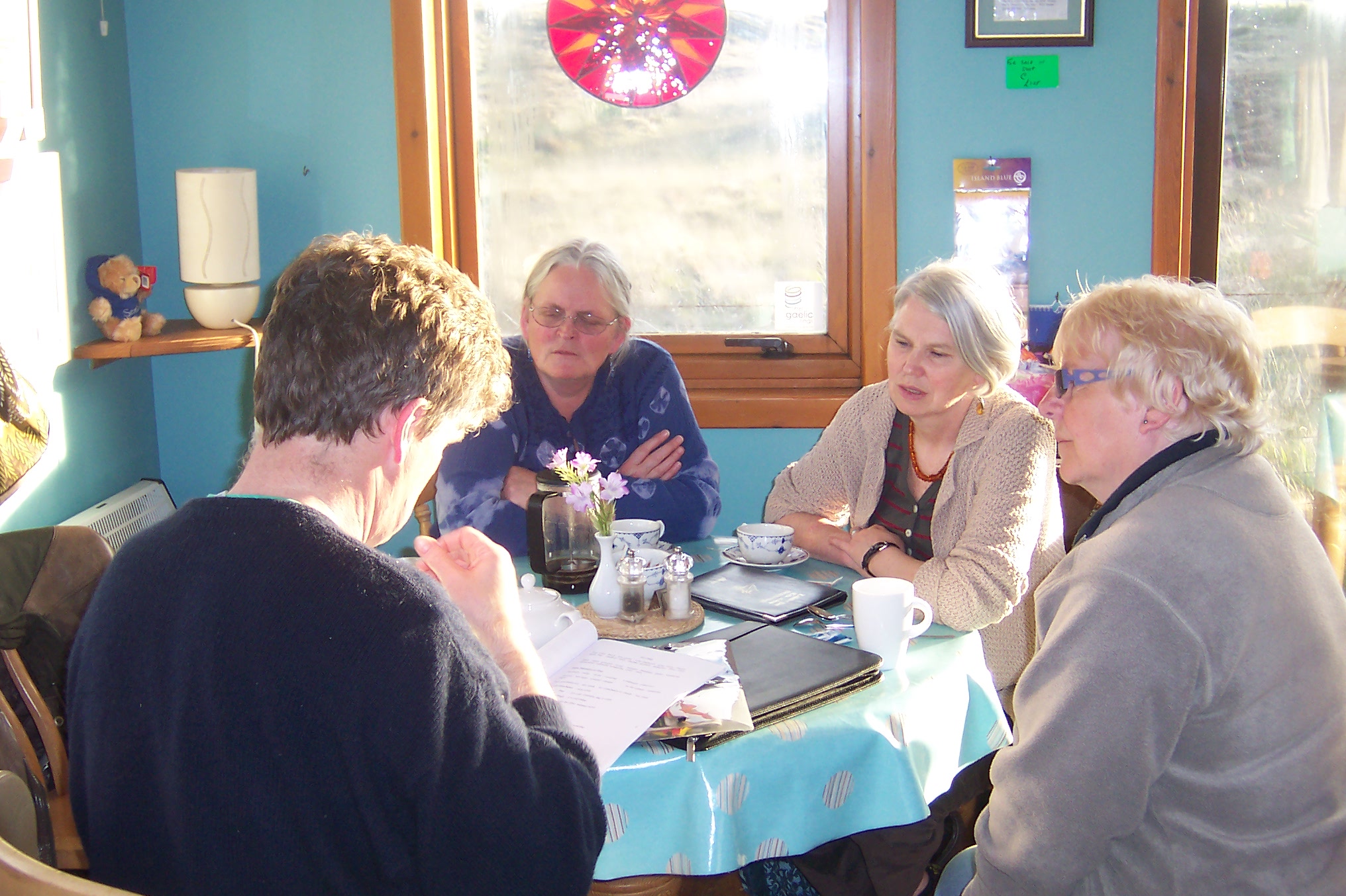 Island Voices Co-ordinator Gordon Wells was in Berneray last night, visiting one of the classes for Gaelic learners run by Archie Campbell. The class is held once a fortnight at Iris and Bob’s “The Lobster Pot” – the perfect community venue – with tea and coffee supplied by Iris, who is also a keen member of the class.