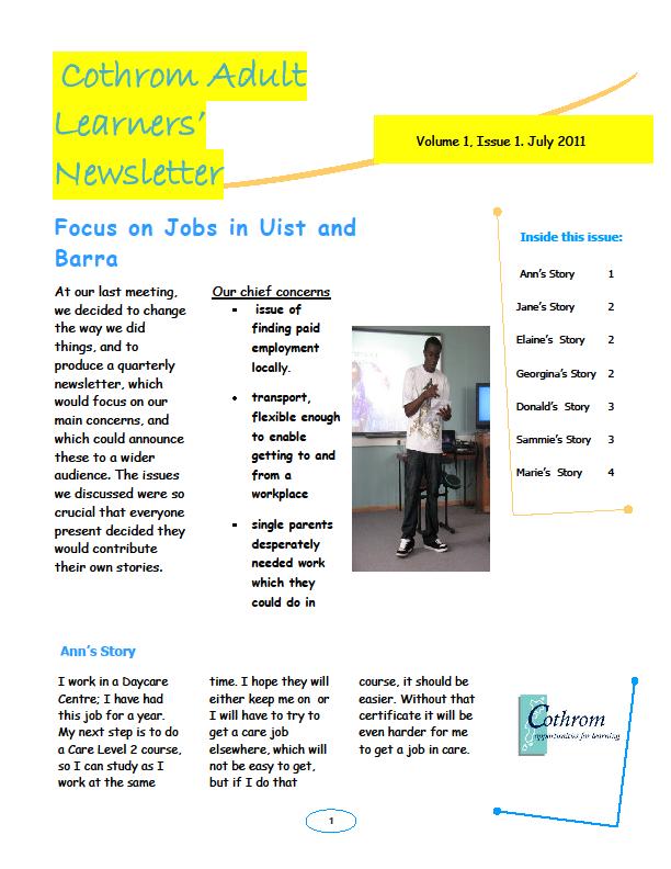 Learners at Cothrom are getting organised, and have decided to produce a quarterly newsletter. It’s nice to see ESOL learner Marie’s story from Barra featured in the first edition. It is reproduced below, but you can see the whole newsletter by clicking on this link. Maybe a Gaelic learner will write something for the next issue?