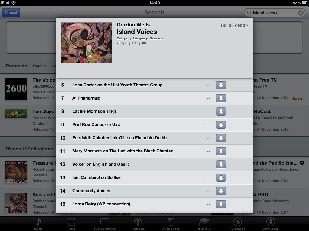 As of this month the original Island Voices audio channel has been linked into iTunes. This means that you can download the latest audio clips on that channel as podcasts, for repeated listening on your iPad, iPhone, or other preferred device – with or without an Internet connection. If you search for “Island Voices” in iTunes podcasts you will find the channel in the Education category (subcategory “Language Courses”), or you can click on the graphic or this link. You can also subscribe directly to the podcast page. Happy listening!