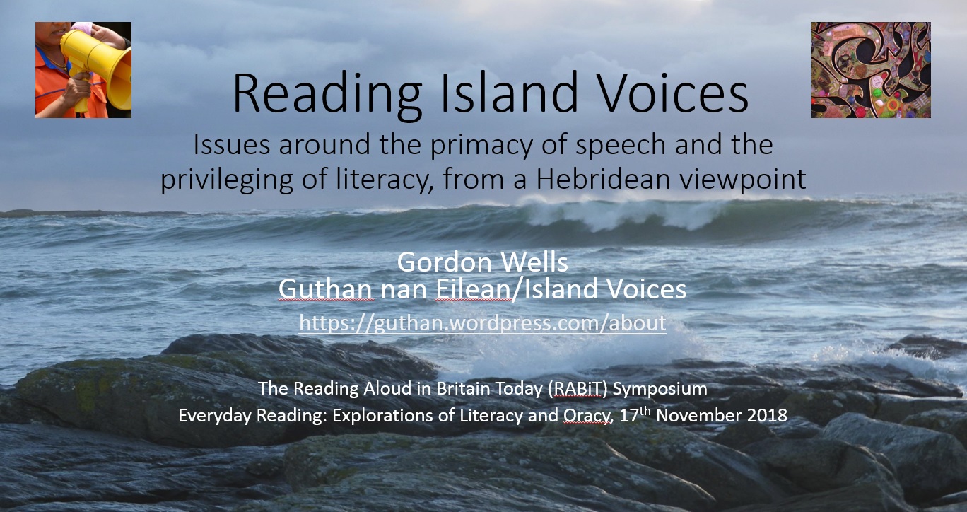In a gathering of researchers and educators from around the country, Gordon Wells was delighted to get the opportunity to speak about the Island Voices project, and its own approach to speech and writing and the uses made of Reading Aloud. Gordon’s subject was “Reading Island Voices: Issues around the Primacy of Speech and the Privileging of Literacy, from a Hebridean Viewpoint”. You can read the script of his talk here.