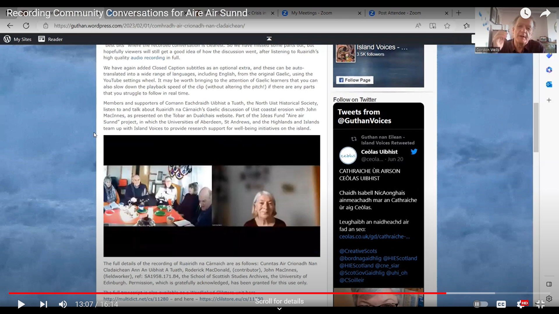 Adopting a slightly different format to Jess Wood’s presentations last week, Gordon speaks to camera on Zoom while screen-sharing key content from the Island Voices Aire air Sunnd webpage. Speaking in Gaelic he reinforces the point that using this language does not exclude non-speakers or early learners, given the multilingual technical resources that are now available online.