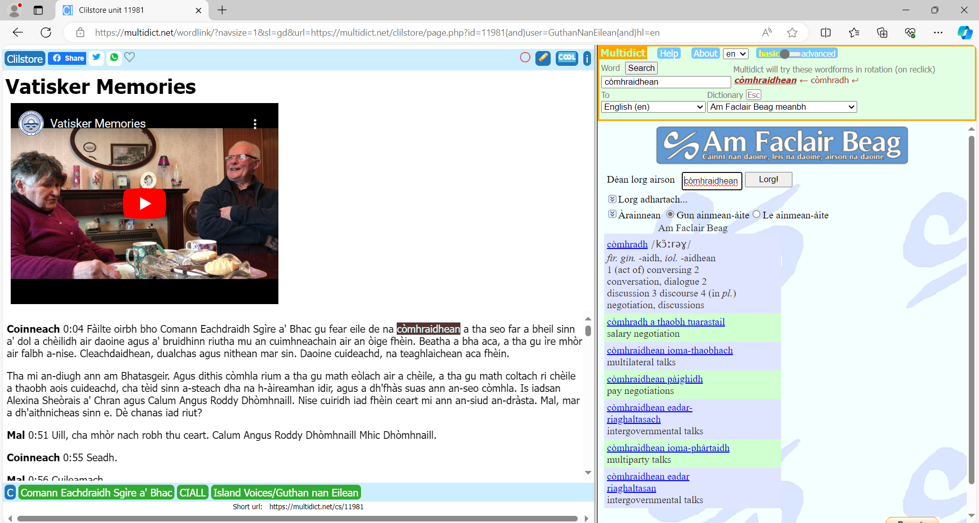 The examples of unscripted speech are from a conversation in which Christie talks to fellow Shetlander Chris Stout, who is also now a Glasgow resident.